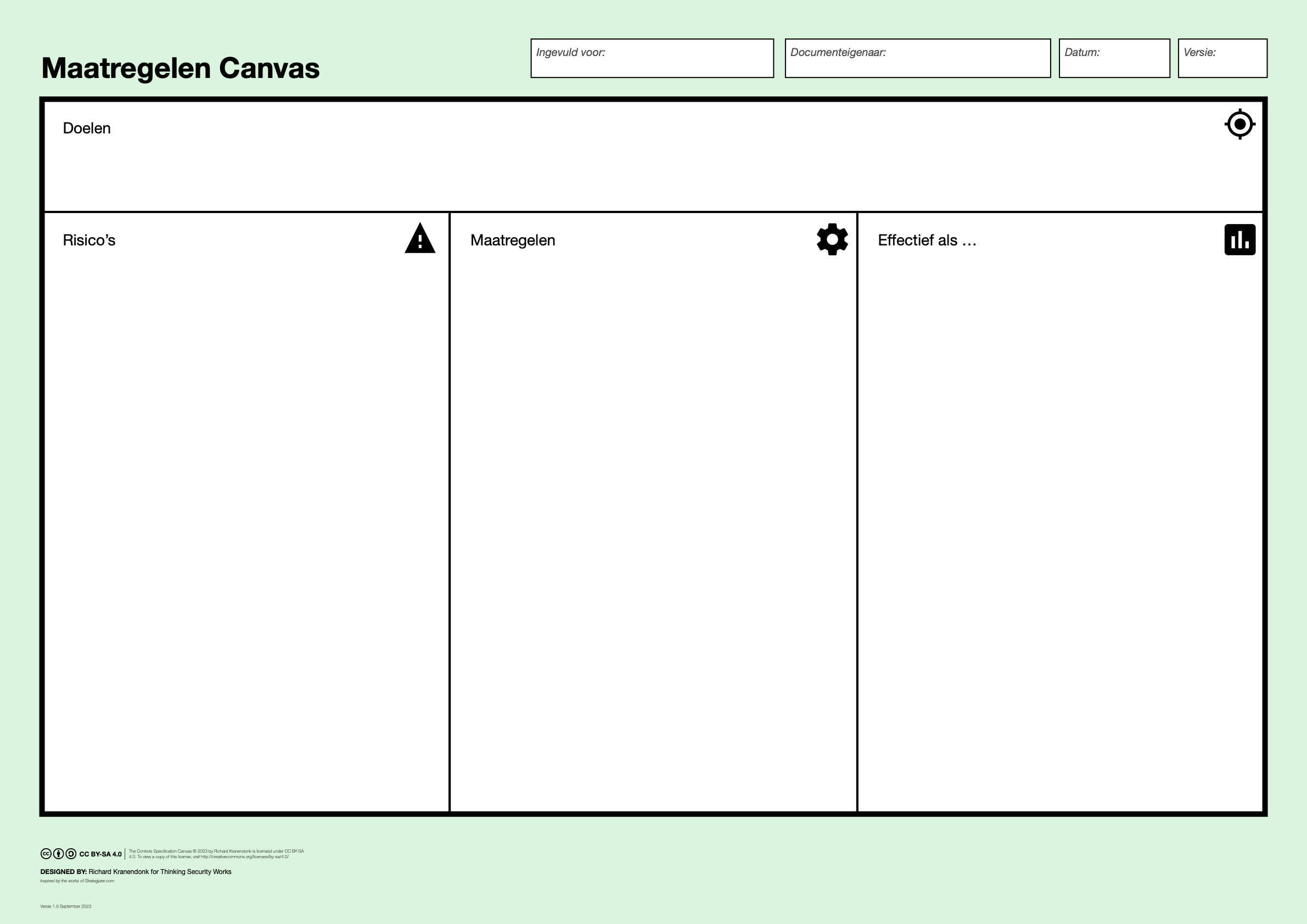 Voor ieder Risico bespreekt het team, welke maatregelen zouden helpen om het risico te verlagen. Deze worden op Post-Its genoteerd en op het Canvas geplakt (kolom Controls), naast het Risico waarop ze betrekking hebben.